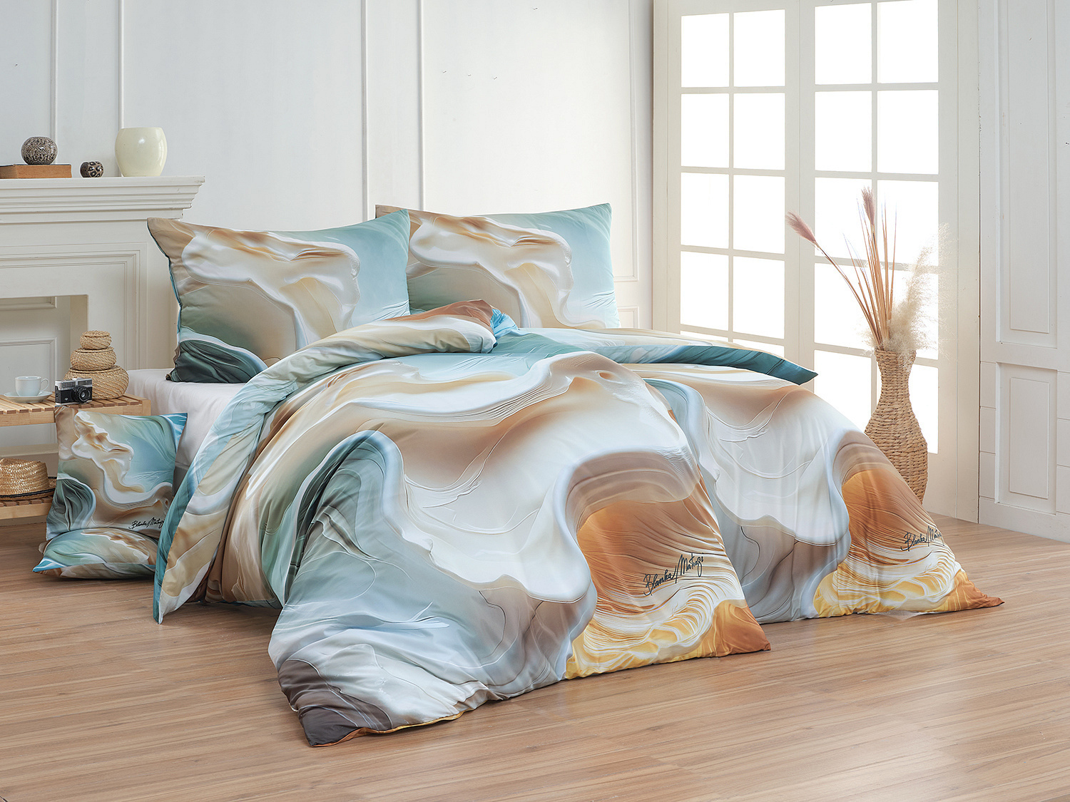 V tomto autorském digitálně zpracovaném motivu se harmonicky prolínají krémové, béžové a mátově zelené odstíny, zvýrazněné zářivým jantarovým tónem. Nejmodernější digitální tisk zajišťuje věrný detail přesně dle autorčina záměru, motiv je z obou stran povlečení stejný.