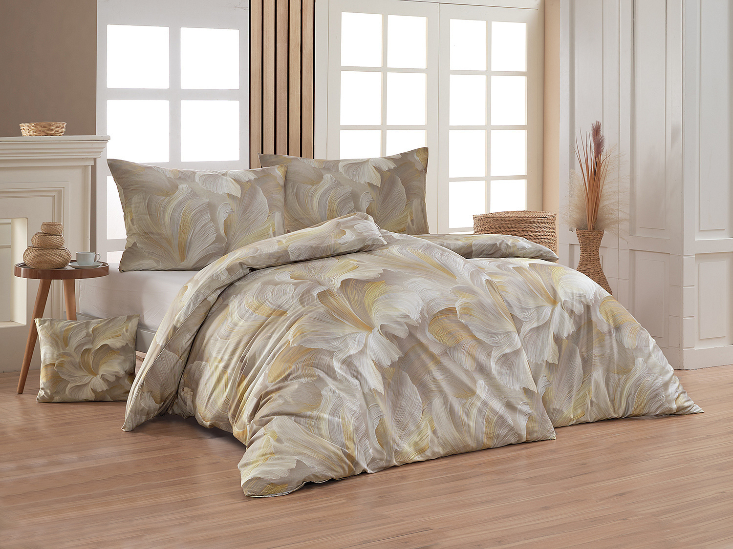 Ložní povlečení Harmonia kombinuje krémové, šedobéžové a zlatavé tóny v abstraktním květinovém motivu, který působí lehkým a vzdušným dojmem. Decentní barevnost dodává designu nadčasový charakter a umožňuje snadné sladění s různými styly interiéru. Jemný lesk bavlněného saténu podtrhuje elegantní vzhled tohoto autorského motivu.
