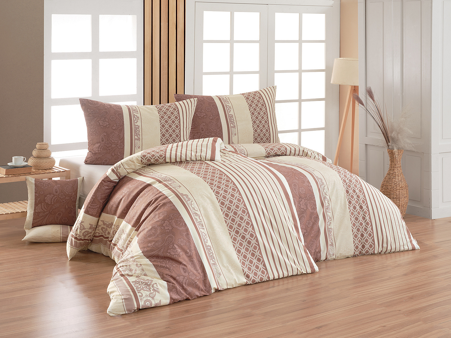 Dopřejte své ložnici harmonii a nadčasovou eleganci s bavlněným povlečením Linda. Povlečení v jemné kombinaci béžových a hnědých tónů působí klidně a hřejivě, zatímco kombinace pruhů a decentních ornamentálních vzorů dodává celku zajímavou dynamiku.