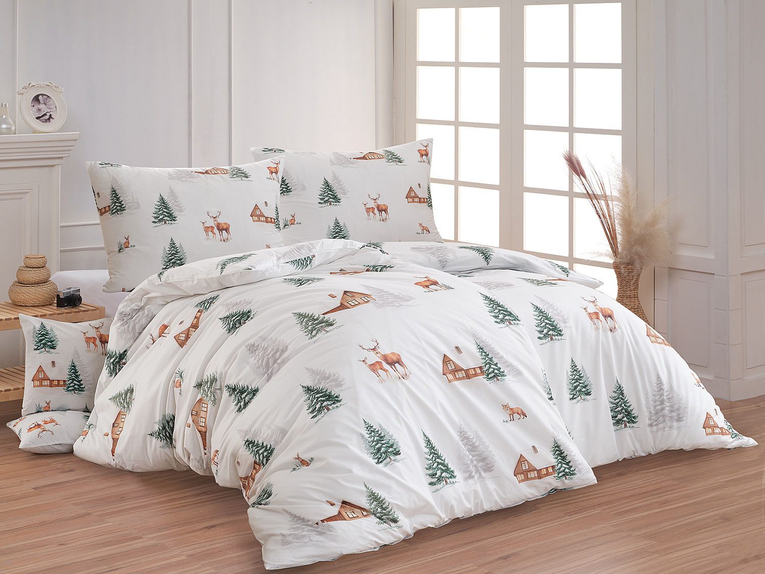 Povlak na polštář i na přikrývku zachycuje na vrchní straně zimní motiv se stromky, chaloupkami a snkami, povlak na polštář zdobí na vrchní straně malé logo "M" v pravém dolním rohu. Spodní stranu povlečení tvoří zjednodušený zimní motiv bez chaloupek a lesní zvěře. Povlečení je opatřeno komfortním zipovým uzávěrem.