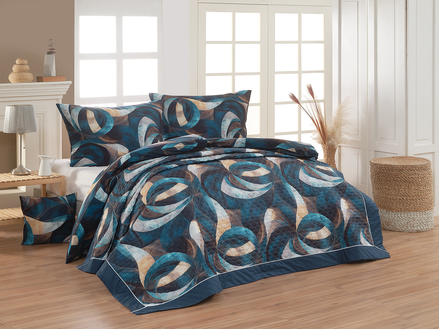 Barevné provedení: Abstraktní motiv v paletě modrých, petrolejových a pískových tónů, který je z obou stran přehozu stejný. Okraje zdobí modrozelené lemování doplněné na vrchní straně světlou paspulí.