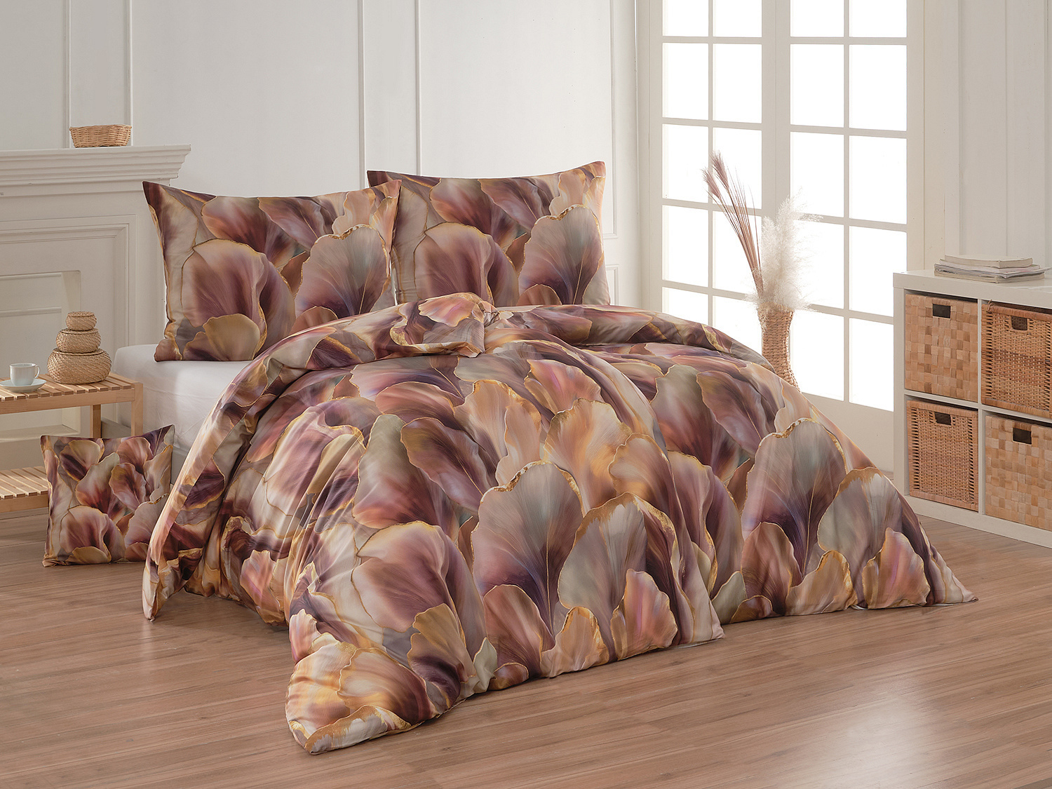 Ložní povlečení Serafina se stane elegantní dominantou každého interiéru. Velkoformátový florální vzor v hřejivé paletě hnědých, měděných a fialových tónů doplňují jemné plynulé line, které dodávají designu hloubku. O precizní detail potisku se zasloužila nejmodernější digitální tisková technologie. Hebký bavlněný satén s decentním leskem podtrhuje sofistikovaný charakter tohoto jedinečného autorského motivu.