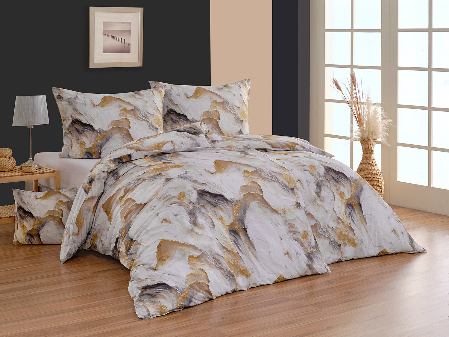 Bavlněné povlečení Solara v paletě krémových a šedých tónů s jemnými zlatavými akcenty najde své místo v moderním i klasickém interiéru. Vzor inspirovaný strukturou přírodního kamene působí přirozeně a zároveň velmi elegantně. Plynulé přechody barev a propracované detaily dodávají designu hloubku a nadčasový charakter. O precizní detail potisku se postarala nejmodernější digitální tisková technologie.