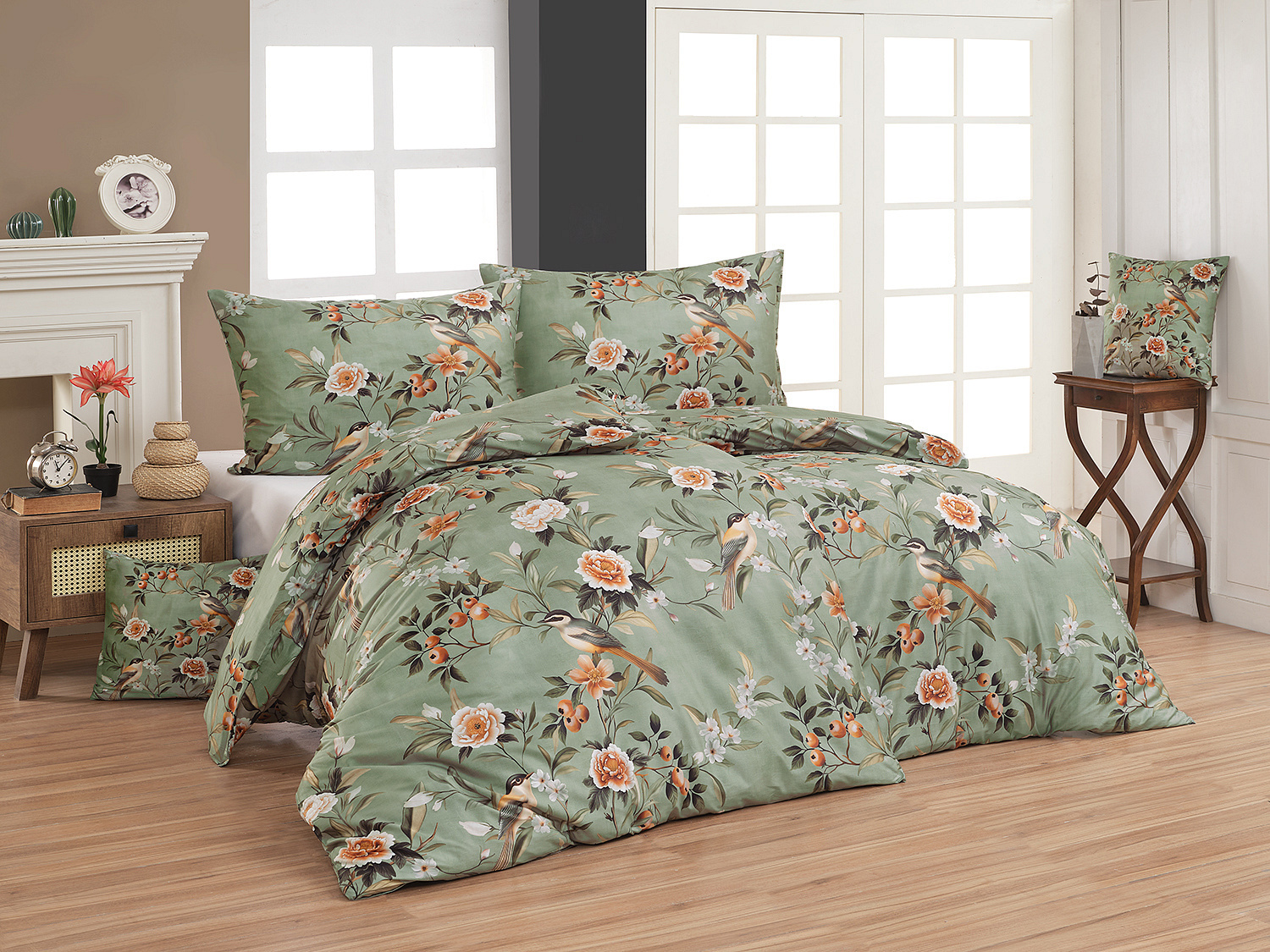 Nechte svou ložnici rozkvést s okouzlujícím bavlněným povlečením Stella. Vzor planých růží v meruňkových tónech doplněný motivem drobného ptactva vyniká na pastelově zeleném podkladu a vnese do interiéru nádech svěžesti. Díky nejmodernějšímu digitálnímu potisku vyniká vzor v precizním detailu a celkový dojem je dotažený k dokonalosti povrchovou úpravou hebkého bavlněného saténu, který propůjčuje ložnímu povlečení decentní lesk.
