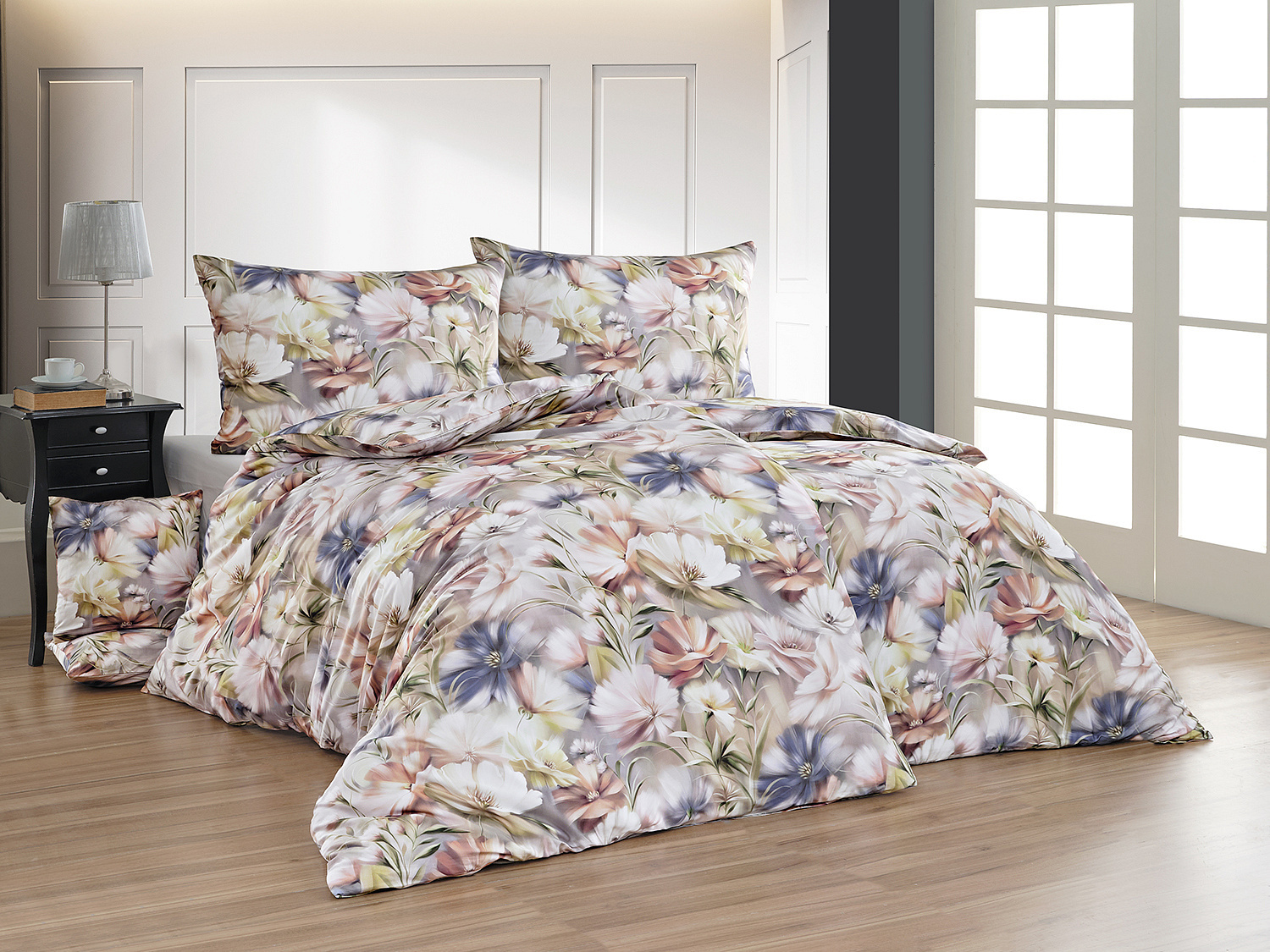Tento romantický florální vzor přináší bohatou kompozici pestrých květů, které díky jemným barevným přechodům přirozeně splývají s podkladem a vytvářejí tak harmonický celek. Kombinace bílých, pudrových a modrých tónů působí svěže, vzdušně a velmi elegantně. Povlak na polštář i na přikrývku je z obou stran stejný, vrchní stranu povlaku na polštář zdobí malé logo "M" v pravém dolním rohu. Povlečení je opatřeno komfortním zipovým uzávěrem.