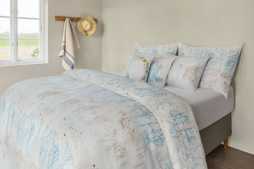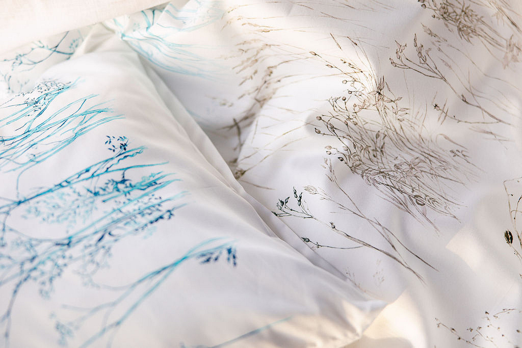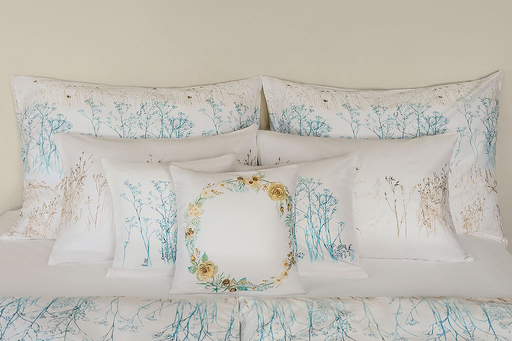 Každý motiv je jiný, přesto spolu ladí jako rodina – od něžných lemů růží přes nadčasovou modrobílou až po poetiku stébel a šťavnaté tóny lesních plodů. Celou kolekci doplňuje první prošívaný přehoz z luxusního bavlněného saténu (motiv Růže) a kolekce autorských dekoračních povlaků.